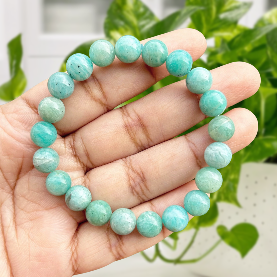 Introducing our Amazonite Gemstone Bracelet—a radiant token of serenity and renewal. Crafted with precision and care, this bracelet harnesses the tranquil energy of Amazonite to soothe the soul and invite good luck and fortune into your life. With its gentle touch, Amazonite rejuvenates all seven chakras, restoring balance and harmony within. Feel your creativity and imagination flourish as this remarkable stone opens the floodgates of inspiration. Let go of past hurts and embrace a newfound sense of openness as your heart reawakens to receive love from others. With every wear, experience a profound shift towards joy, peace, and serenity as Amazonite helps release and heal emotional trauma, paving the way for a brighter, more vibrant future. Embrace the transformative power of Amazonite and embark on a journey of inner healing and renewal with our exquisite gemstone bracelet.