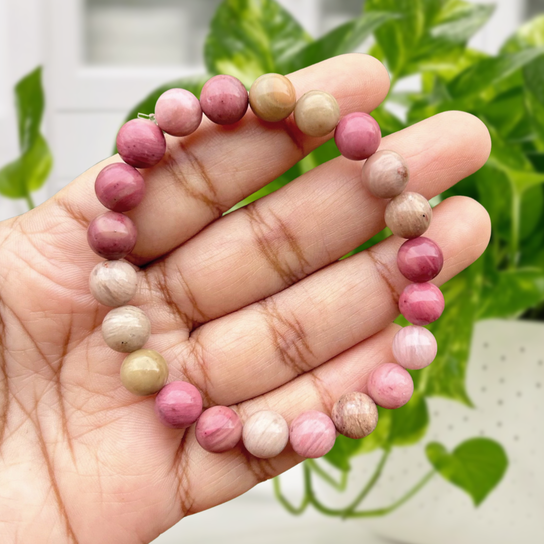 Genuine Natural Rhodochrosite. This bracelet comes in one standard size, stretching to fit wrist sizes ranging from 6 inches (loose fit) to 7 inches (snug fit). Bead size is ~8mm in diameter. Held together by a very durable clear stretch nylon. Packaged in a branded microfibre pouch.