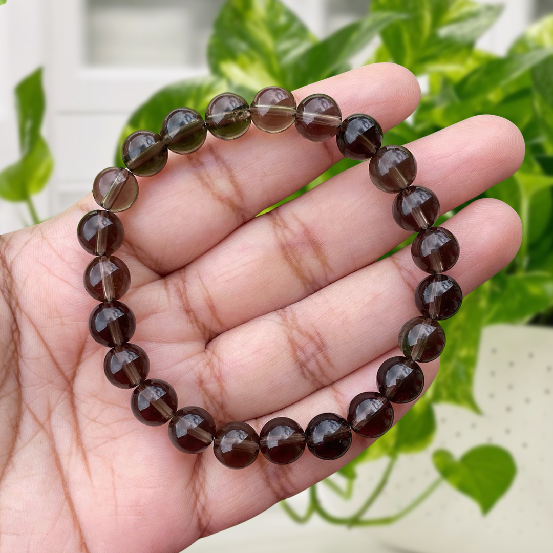 Genuine Natural Smoky Quartz. This bracelet comes in one standard size, stretching to fit wrist sizes ranging from 6 inches (loose fit) to 7 inches (snug fit). Bead size is ~8.5mm in diameter. Held together by a very durable clear stretch nylon. Packaged in a branded microfibre pouch.